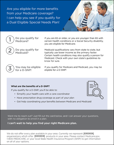 While you cannot scout potential clients, you can host a compliant Medicare educational or sales event or leave compliant promotional materials where D-SNP prospects might go. These actions can help you stand out as a resource in your community for D-SNP prospects to come to you.